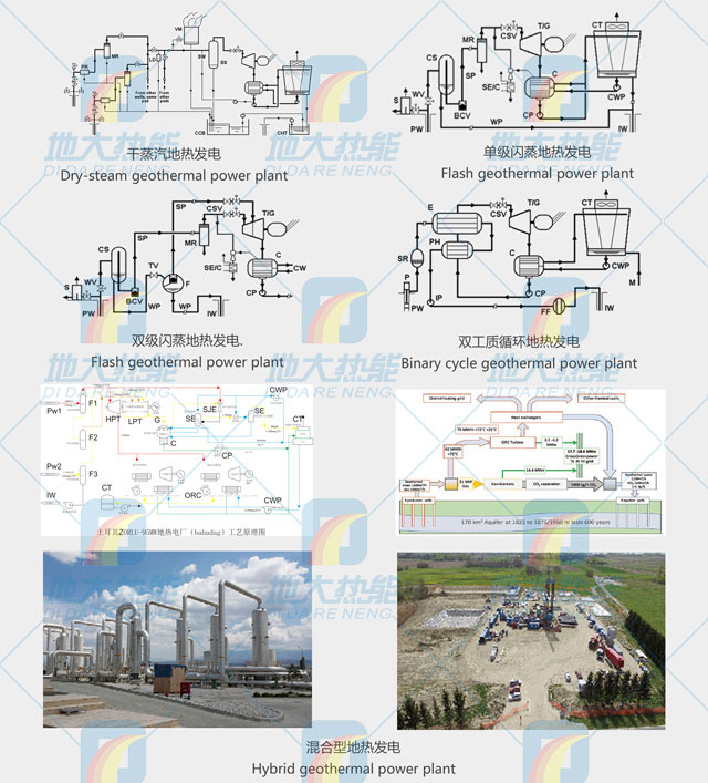 地?zé)岚l(fā)電需根據(jù)地?zé)崃黧w的溫度、壓力以及它們的水、汽品質(zhì)的不同而采取不同的設(shè)計(jì)方案。其主要類(lèi)型包括:干蒸汽地?zé)岚l(fā)電、單級(jí)閃蒸地?zé)岚l(fā)電、雙級(jí)閃蒸地?zé)岚l(fā)電、一井一站地?zé)岚l(fā)電、混合型地?zé)岚l(fā)電、雙工質(zhì)循環(huán)地?zé)岚l(fā)電、干熱巖發(fā)電。