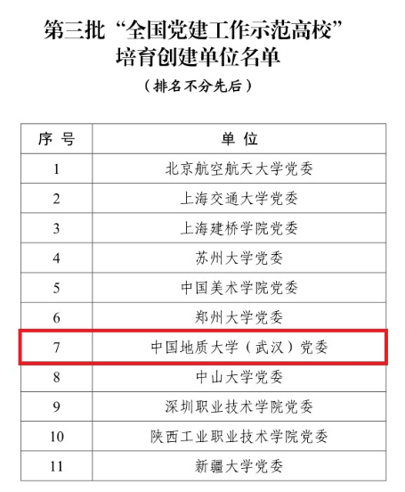 近日,教育部下發了《教育部辦公廳關于公布第三批全國黨建工作示范高校、標桿院系、樣板支部培育創建單位名單的通知》,公布了第三批新時代高校黨建示范創建和質量創優工作評審結果,遴選產生了11個全國黨建工作示范高校、100個全國黨建工作標桿院系、1000個全國黨建工作樣板支部。中國地質大學(武漢)黨委入選“全國黨建工作示范高校”培育創建單位,環境學院“張國旗班”黨支部、工程學院勘察與基礎工程系黨支部入選“全國黨建工作樣板支部”培育創建單位。
